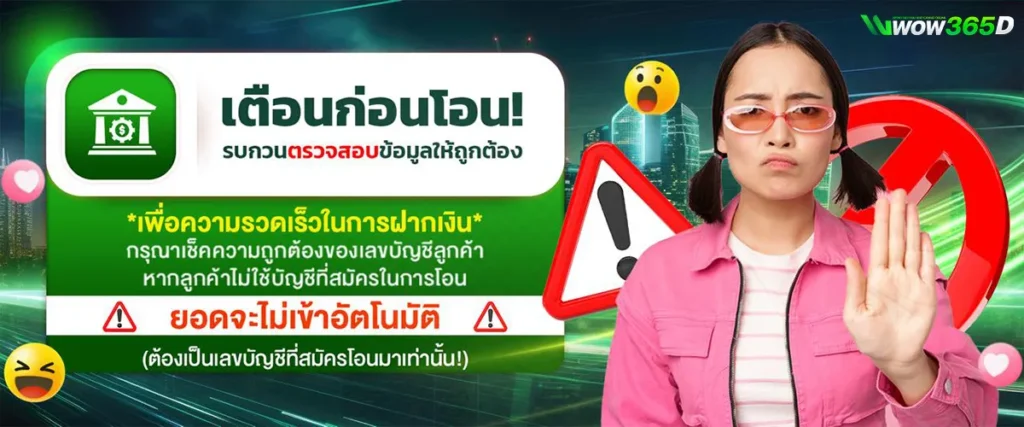 เพื่อให้ผู้เล่นทุกคนสามารถเข้าถึงการเดิมพันได้อย่างสะดวกที่สุด WOW365D.COM จึงพัฒนาระบบการฝาก-ถอนให้ รองรับทุกช่องทางการโอนยอดนิยม ไม่ว่าจะเป็นบัญชีธนาคารชั้นนำในประเทศไทย หรือผ่านแอป True Money Wallet ก็สามารถทำรายการได้ง่าย ๆ ภายในไม่กี่วินาที ระบบของเราทำงานแบบอัตโนมัติ 100% เพียงคุณกดโอนตามเลขบัญชีหรือเบอร์วอลเล็ตที่ระบบแจ้ง ยอดจะถูกปรับให้อัตโนมัติในทันที ไม่ต้องส่งสลิป ไม่ต้องรอนาน และ ไม่มีขั้นต่ำในการทำรายการ จะฝากหลักสิบหรือหลักพันก็สะดวกไม่ต่างกัน ไม่ว่าคุณจะใช้งานผ่านมือถือ แอปธนาคาร หรือวอลเล็ต ก็มั่นใจได้ว่าการทำธุรกรรมกับ WOW365D เข้าสู่ระบบ จะปลอดภัย ลื่นไหล และไม่มีสะดุดแน่นอน เพราะเราใส่ใจทุกขั้นตอน เพื่อให้คุณได้โฟกัสกับความสนุกจากเกมสล็อตได้อย่างเต็มที่